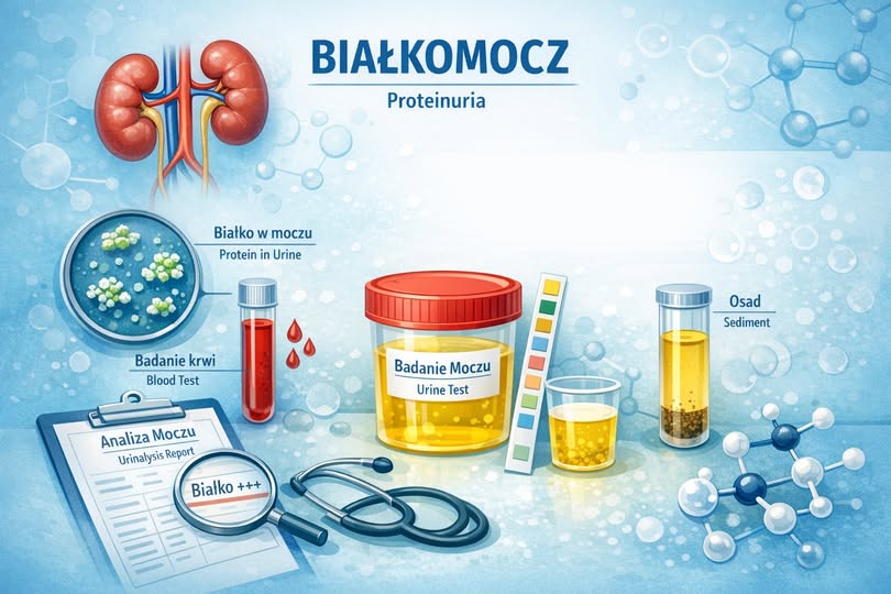 – białka (czyli białkomocz) może być objawem zarówno uszkodzenia nerek jak i chorób serca. Niestety jest to częste powikłanie w chorobach sercowo-naczyniowych. W niektórych przypadkach współwystępowanie białkomoczu i schorzeń kardiologicznych (np. kardiomiopatii, zaburzeń rytmu serca) może wskazywać na potrzebę poszerzonej diagnostyki. Wysokie ciśnienie krwi jest również częstą przyczyną uszkodzenia nerek i może prowadzić do białkomoczu.
